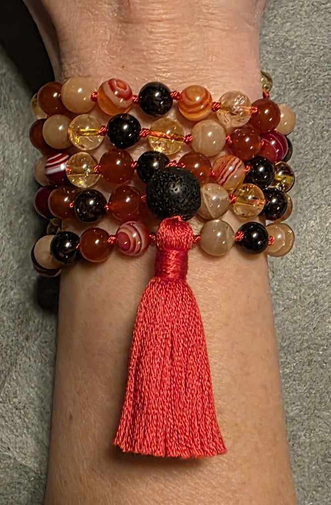 108 gemstone beads, hand knotted and blessed with sacred mantras.