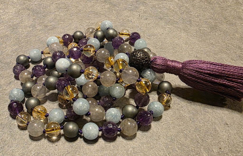 108 gemstone beads, hand knotted and blessed with sacred mantras.