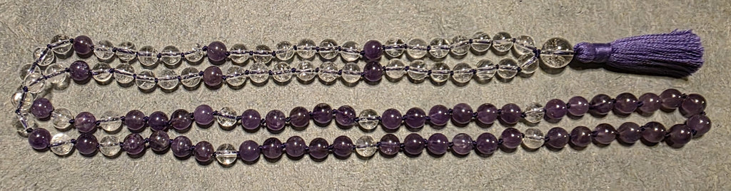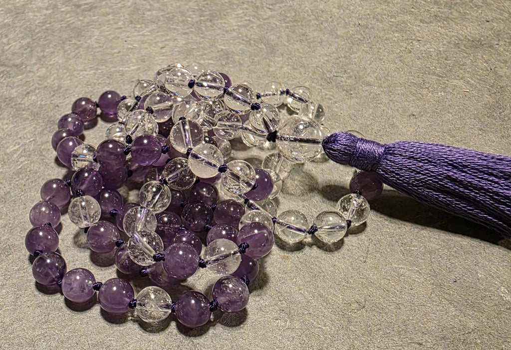 108 gemstone beads, hand knotted and blessed with sacred mantras.